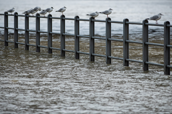 人们聚集在涨水的塞纳河畔。