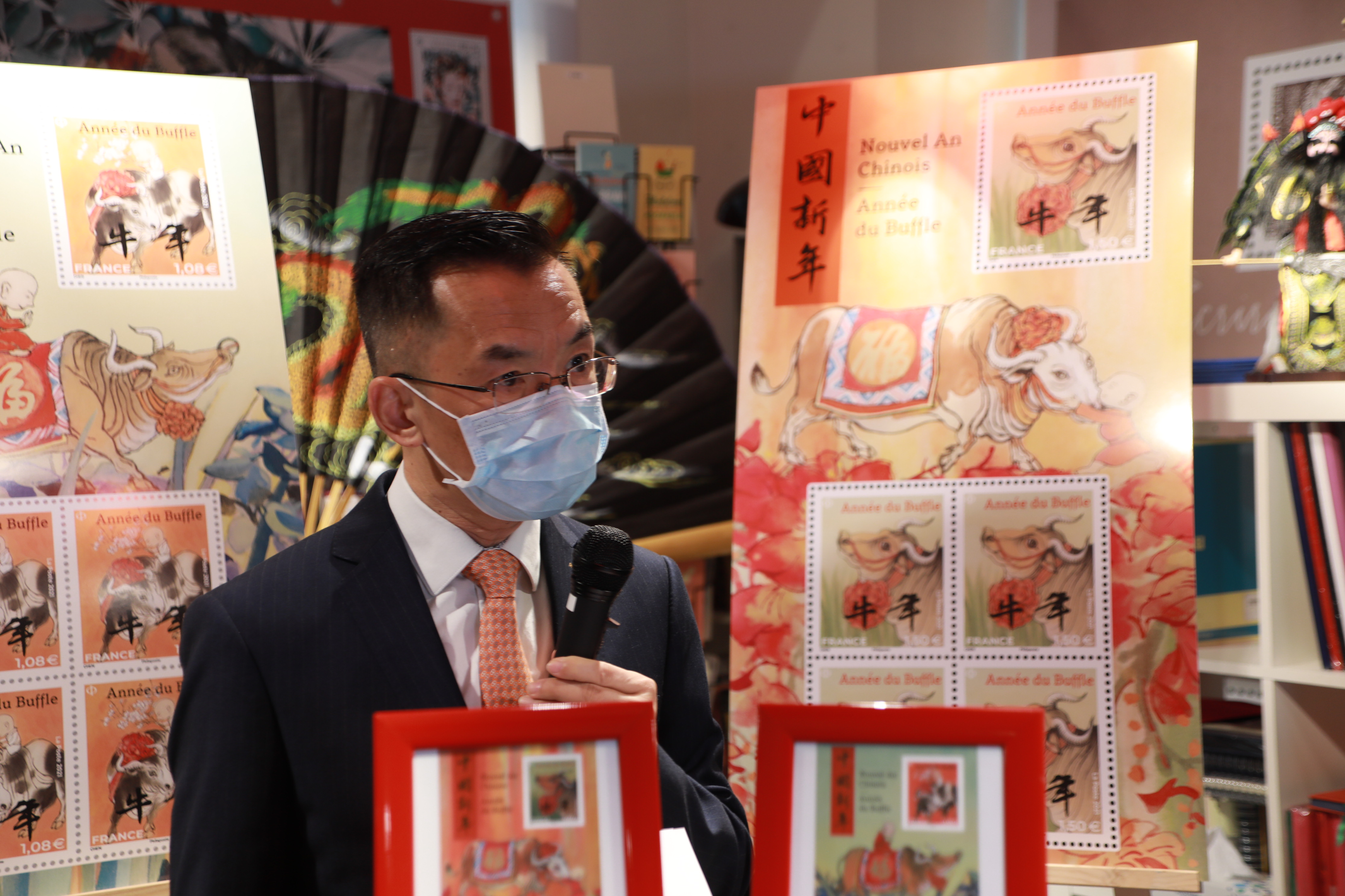 (欧洲时报记者欧文报道)法国当地时间2月6日,法国邮政在位于巴黎9区的法国邮政集邮公司墨方厅举行农历辛丑牛年邮票发行仪式,中国驻法大使卢沙野应邀出席。