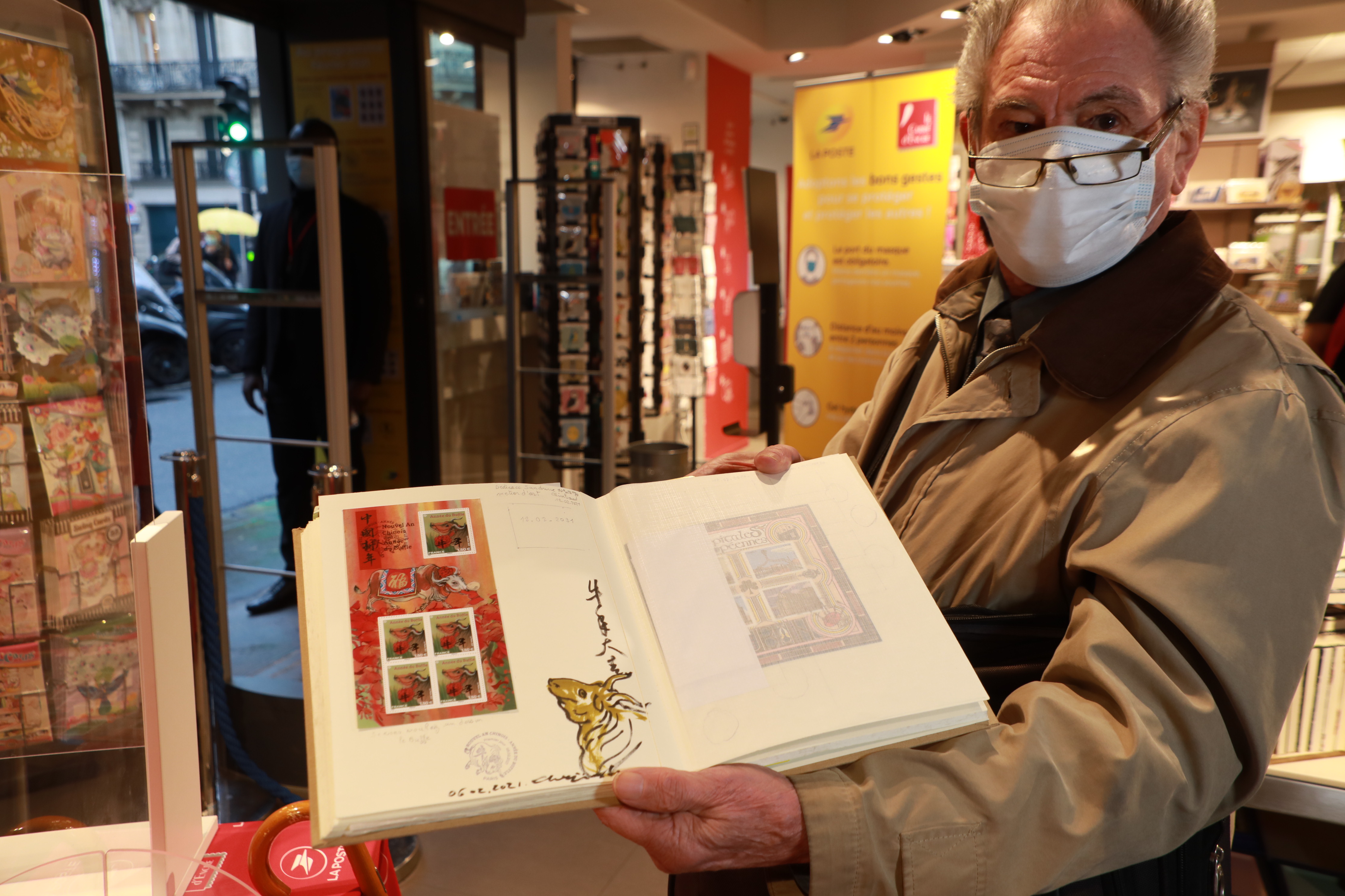 一名法国集邮爱好者向记者展示设计师陈江洪的绘画签名