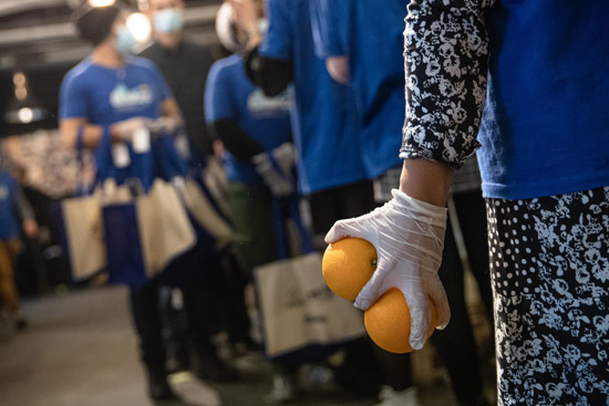 学生排队等待领取慈善机构的志愿者们发放免费食品。