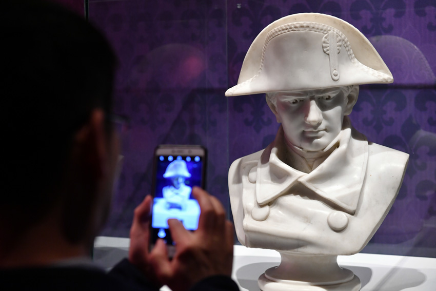 “法兰西的雄鹰——拿破仑文物(中国)巡回展览”的参观者为拿破仑的大理石雕塑拍照。(图片来源:中新社)