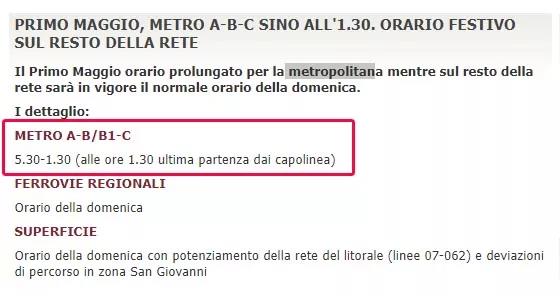 据意大利Tg24.sky网站报道,由于5月1日晚罗马将在Piazza San Giovanni广场举办传统的五一劳动节音乐会,因此地铁A线、B线和C线的运营时间将会延长2小时。末班车的发车时间为5月2日凌晨1时30分。