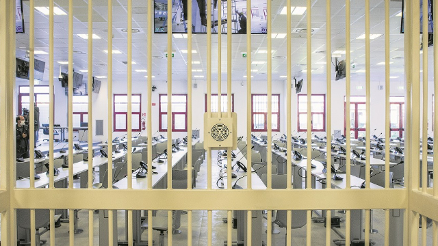 这是去年12月15日拍摄的为此次审理特别修建的、增加了保安设施的审判庭,它位于卡拉布里亚地区拉梅齐亚泰尔梅市。(法新社图)