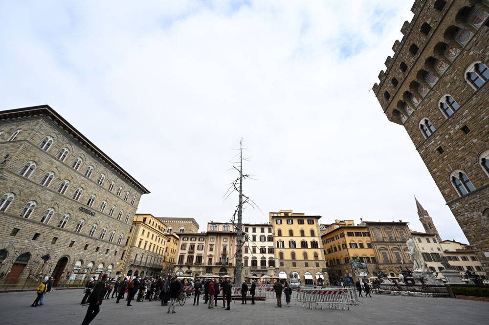 3月25日,一棵22米高的冷杉雕塑在佛罗伦萨被竖起,以纪念但丁逝世700周年。(图片来源:新华社)