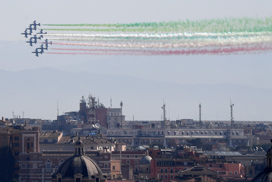 意大利“三色箭”飞行表演队从罗马上空飞过,留下代表意大利国旗颜色的三色彩烟。