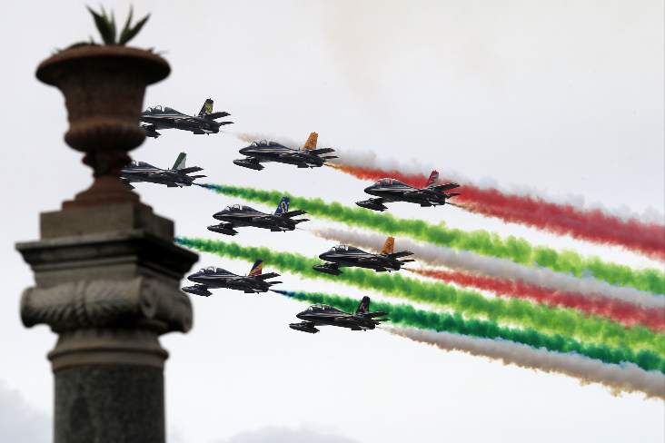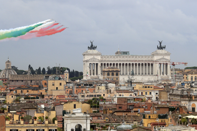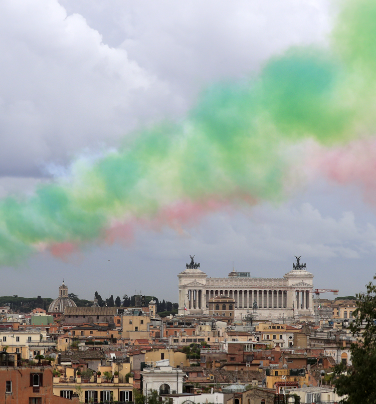 意大利“三色箭”飞行表演队喷出象征国旗三色的烟雾飞过罗马上空,庆祝国家团结日。