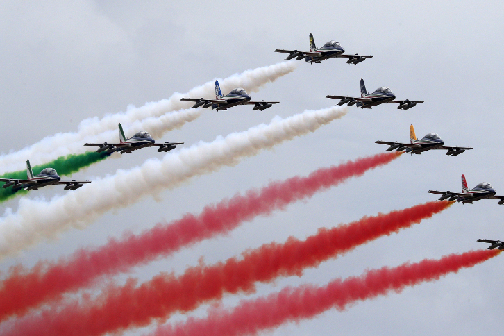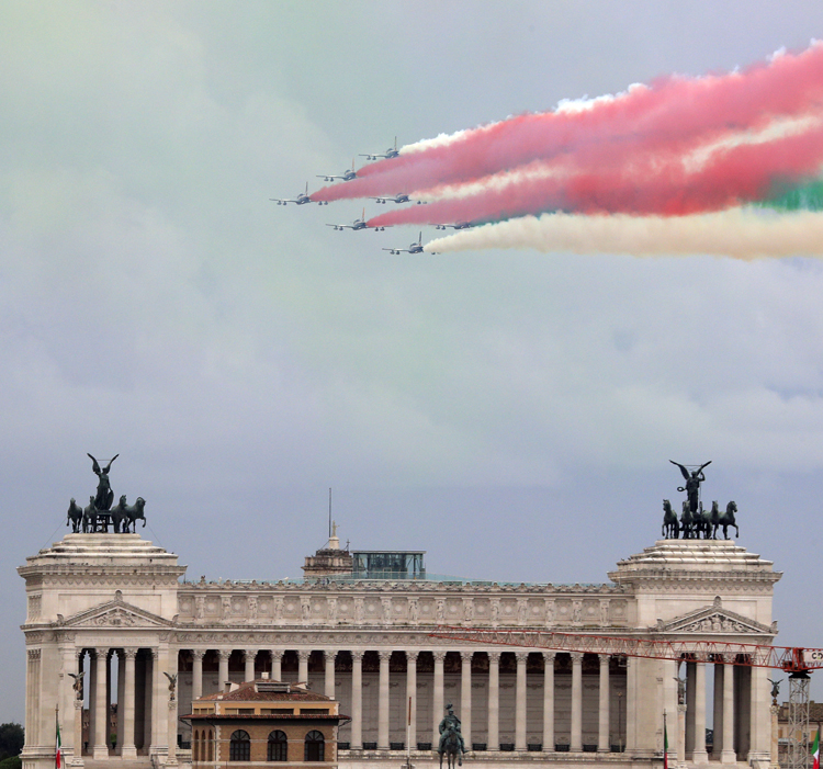 意大利“三色箭”飞行表演队喷出象征国旗三色的烟雾飞过罗马威尼斯广场上空。