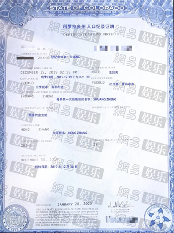 另一份《科罗拉多州人口记录出生证明》显示,男童出生时间为2019年12月19日,母亲在第一次结婚前的名字为“SHUANG ZHENG”,婴儿出生时母亲的年龄和母亲出生地未显示;父亲姓名为“HENG ZHANG”,父亲出生地中国,年龄29。(图片来源:网易娱乐)