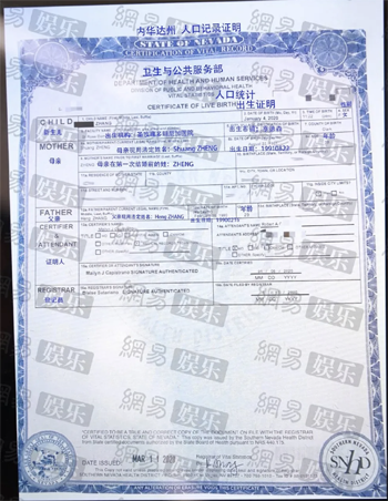 一份《内华达州人口记录出生证明》显示,女童出生时间为2020年1月4日,母亲现用法定姓名“Shuang ZHENG”,年龄28,父亲现用法定姓名“Heng ZHANG”,年龄29,父亲生日为1990年2月16日。(图片来源:网易娱乐)