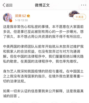 1月19日,郑爽在微博发布回应表示,她没有违背相关法律法规。而多数网友认为,这份回应承认了其在美国进行了代孕事宜。