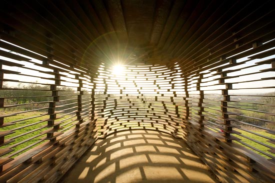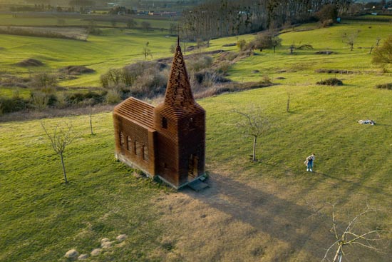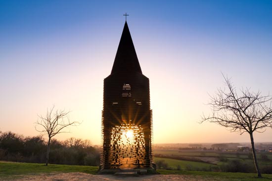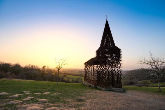 比利时博尔赫隆附近有座“透明教堂”,是一个名为“体会弦外之音”的艺术作品。“透明教堂”的墙体、屋顶及尖顶用扁钢制成,层与层之间留有空隙。当人们观察“透明教堂”的外观时,能看到镂空的墙体与外部环境相融合的景象,而从“透明教堂”内部向外看时,墙体的线条与周边景色相得益彰,别有一番滋味。这座坐落在农田果园间的“透明教堂”已成为当地地标,吸引了众多游客前来。