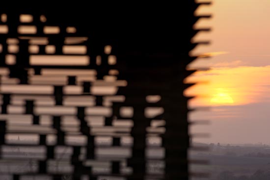 图为2月24日在比利时小镇博尔赫隆附近拍摄的“透明教堂”与落日景观。