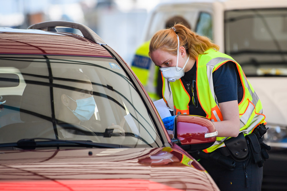 2020年4月23日,德国南部一处德奥边境检查站,警察检查途经车辆。(图片来源:新华社)