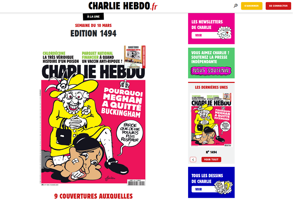 《赫芬顿邮报》法语版报道,3月10日出版的1494期《查理周刊》“循惯例”对时下新闻做出了回应,此次所针对的是于日前播出的梅根与哈里接受美国名嘴奥普拉·温弗里的采访。在本期的头版上,该杂志将梅根对英国王室的种族主义歧视指控进行了戏谑的模仿。