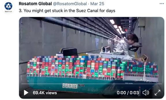 俄罗斯国家核能公司Rosatom日前发推文表示,俄罗斯的北海战略航线可以成为苏伊士运河的有效替代方案。 (图片来源:推特截图)