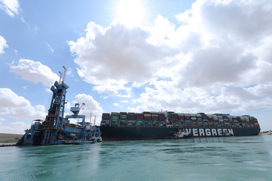 3月26日,救援船只在埃及苏伊士运河上重型货船搁浅现场进行作业。(图片来源:苏伊士运河管理局供图)