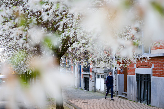 3月29日,一名男子在布鲁塞尔走过盛放的春花。