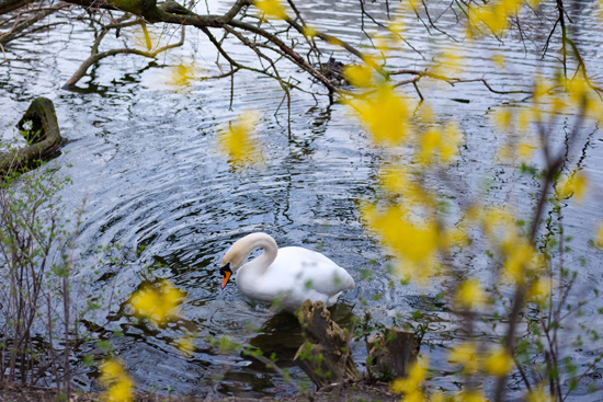 一只天鹅在比利时布鲁塞尔盛开的春花旁栖息。