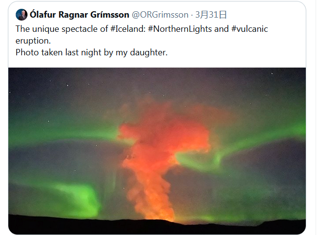 当地居民拍摄到的冰岛极光与火山灰共存的景象。(图片来源:推特截图)