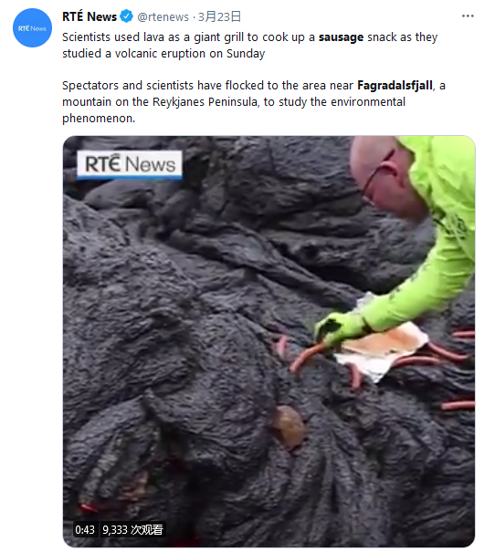 一个科考团队中的科学家将热狗塞入尚未冷却的火山熔岩中,利用岩浆的热度来烤热狗。(图片来源:推特截图)