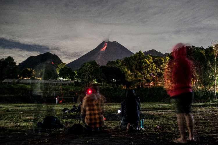 1月20日,在印度尼西亚日惹,人们望向喷发的默拉皮火山。(图片来源:新华社)