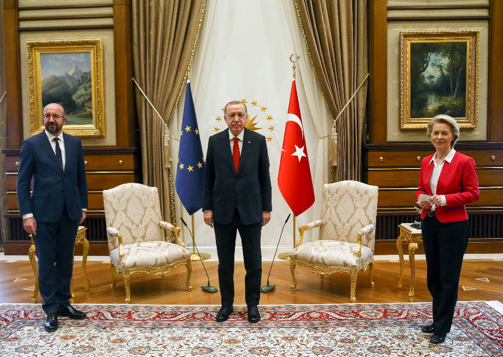 这个明显困惑和愤怒的时刻以视频的方式在网上竞相传播,成为了几乎人尽皆知的“沙发门”,它也很快触发人们对性别歧视的讨论。然而,讽刺的是,这位被“排挤在一旁”的欧盟最高级别女性领导人此次出访的部分目的,就是向土耳其施压,要求土耳其支持妇女权利。最近,土耳其退出了旨在保护妇女权益的国际条约《伊斯坦布尔公约》,冯德莱恩在访问期间特别主张这一主题。