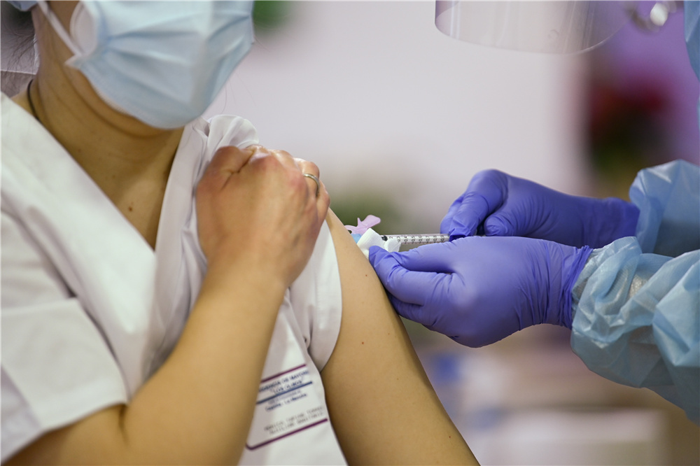 2020年12月27日,护工莫妮卡·塔皮亚斯(左)在西班牙瓜达拉哈拉的洛斯奥尔莫斯养老院内接受新冠疫苗注射。(图片来源:新华社)
