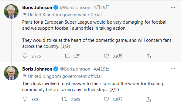 约翰逊在推特上说,此举会给足球带来巨大的伤害,将冲击英国足球的核心;马克龙说,欧超联赛将“威胁足坛的团结和足球运动的美德”,并支持法国的俱乐部拒绝加入欧洲超级联赛。