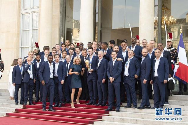 2018年7月16日,法国总统埃马纽埃尔·马克龙携夫人布丽吉特·马克龙在法国巴黎爱丽舍宫迎接凯旋归来的法国队。(图片来源:新华网)