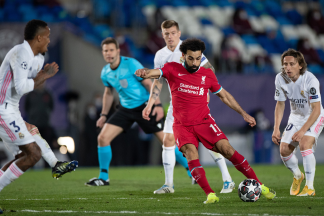 4月6日,在欧洲足球冠军联赛四分之一决赛首回合比赛中,西甲皇家马德里队主场以3比1战胜英超利物浦队。(图片来源:新华社)