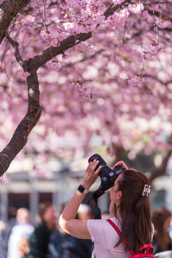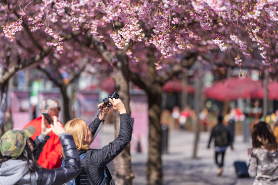 游客在瑞典斯德哥尔摩拍摄樱花。