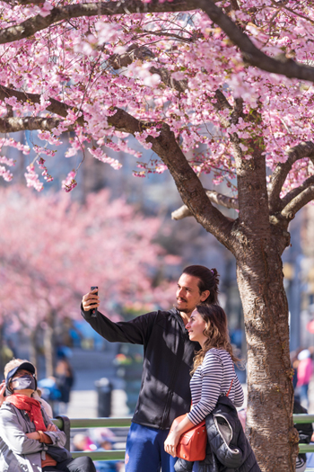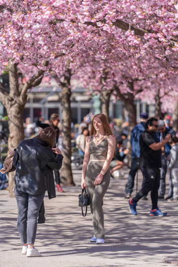 人们在瑞典斯德哥尔摩的樱花树下自拍。