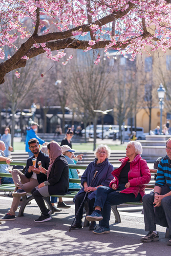 人们在瑞典斯德哥尔摩的樱花树下休息。