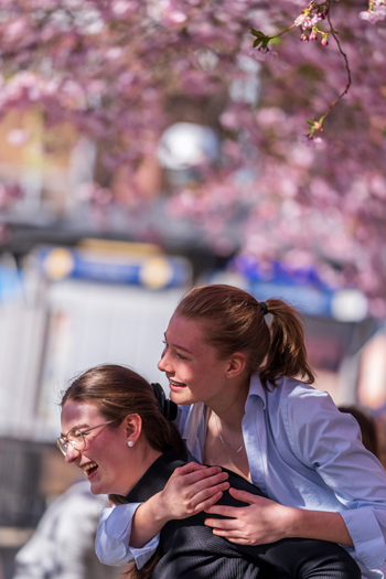 两名女子在瑞典斯德哥尔摩与樱花合影。