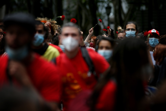 民众佩戴口罩参加在葡萄牙里斯本举行的“四·二五革命”胜利47周年纪念活动。