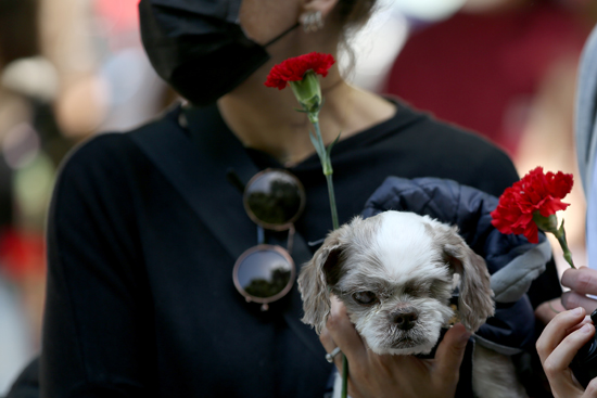 这是4月25日在葡萄牙里斯本“四·二五革命”胜利47周年纪念活动上拍摄的一只小狗。