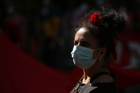 一名女子佩戴口罩参加在葡萄牙里斯本举行的“四·二五革命”胜利47周年纪念活动。