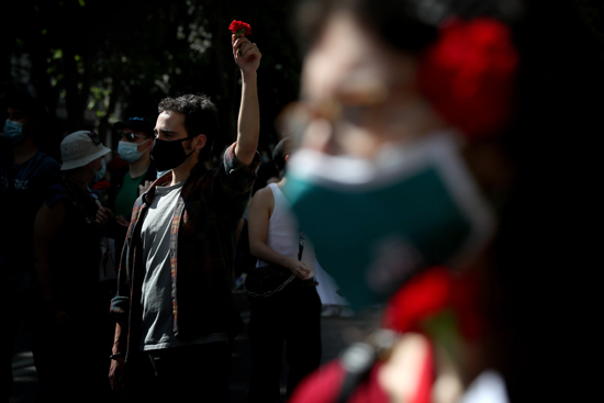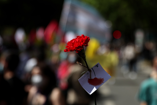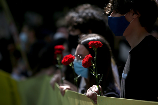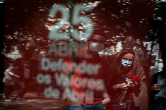 4月25日,民众佩戴口罩参加在葡萄牙里斯本举行的“四·二五革命”胜利47周年纪念活动。(图片来源:本文图片均自新华社)