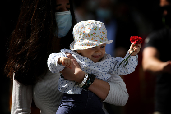 一名女子怀抱孩子参加在葡萄牙里斯本举行的“四·二五革命”胜利47周年纪念活动。