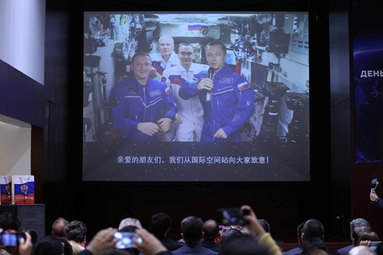 4月12日,世界航天日暨人类首次进入太空60周年庆祝活动在北京举行。该活动由北京俄罗斯文化中心和北京宇航协会联合举办。图为4名俄罗斯航天局宇航员从国际空间站发来视频祝福。(图片来源:中新社)
