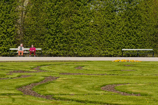 人们坐在奥地利维也纳美泉宫的长椅上。