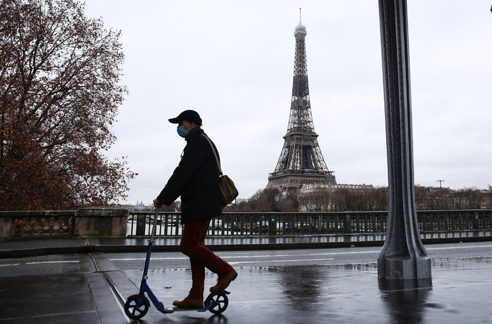 一名行人骑滑板车经过法国巴黎埃菲尔铁塔附近的比尔哈克姆桥。(图片来源:新华社)