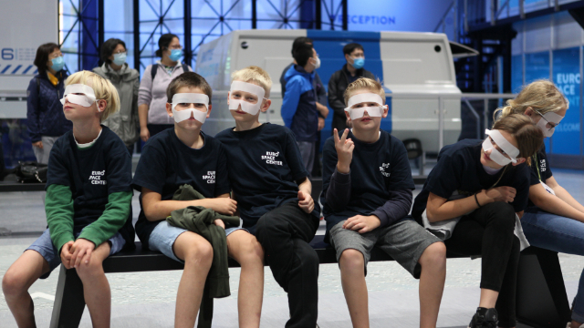 图为比利时欧洲太空中心疫后重启后,在太空中心帮助测试设备、兴致勃勃的小学生。(图片来源:中新社)