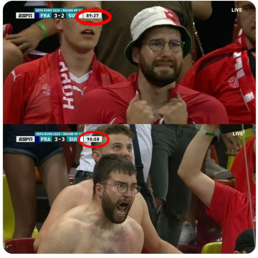 竞技场上有赢就有输,1/8淘汰赛几场刺激的赛事,尤其是法国VS瑞士时,从3:1领先到10分钟内被追平再到输掉点球大战的震惊发展,让两国球迷“在棺材里反复仰卧起坐”,也诞生了若干经典表情包。