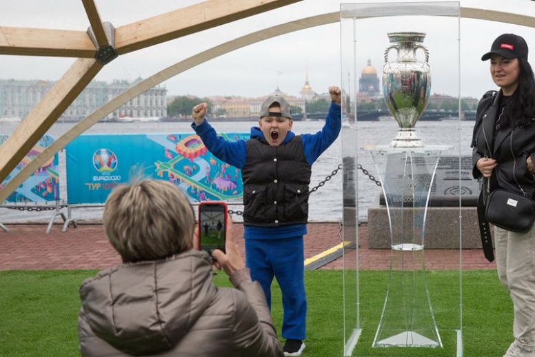 5月23日,一名小朋友在圣彼得堡与德劳内杯合影。(图片来源:新华社)