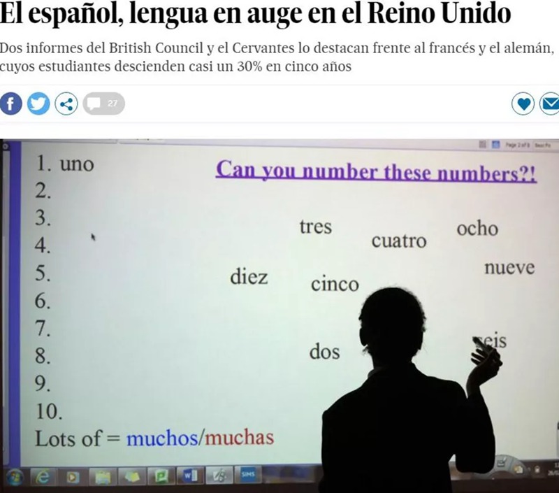 英国文化协会(British Council)和塞万提斯学院的两份报告显示,学习法语和德语的人数在近五年内下降了30%。近数十年来,西班牙语在美国和巴西等国颇受欢迎,而在英国却一直不温不火。然而,上述两份报告却指出,西班牙语将打败法语,成为英国学生的首选外语。到2060年,美国将成为世界第二大西语使用国,仅次于墨西哥。