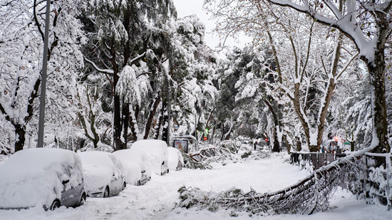 在西班牙马德里市中心,被雪压断的树枝砸在路边停放的车辆上。(图片来源:本文图片均自新华社)