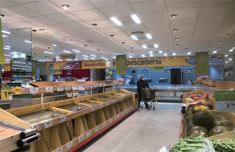 1月14日,马德里一家Ahorramás超市内水果、牛奶、鸡蛋等食物被抢购一空。(图片来源:欧洲时报记者林碧燕 摄)