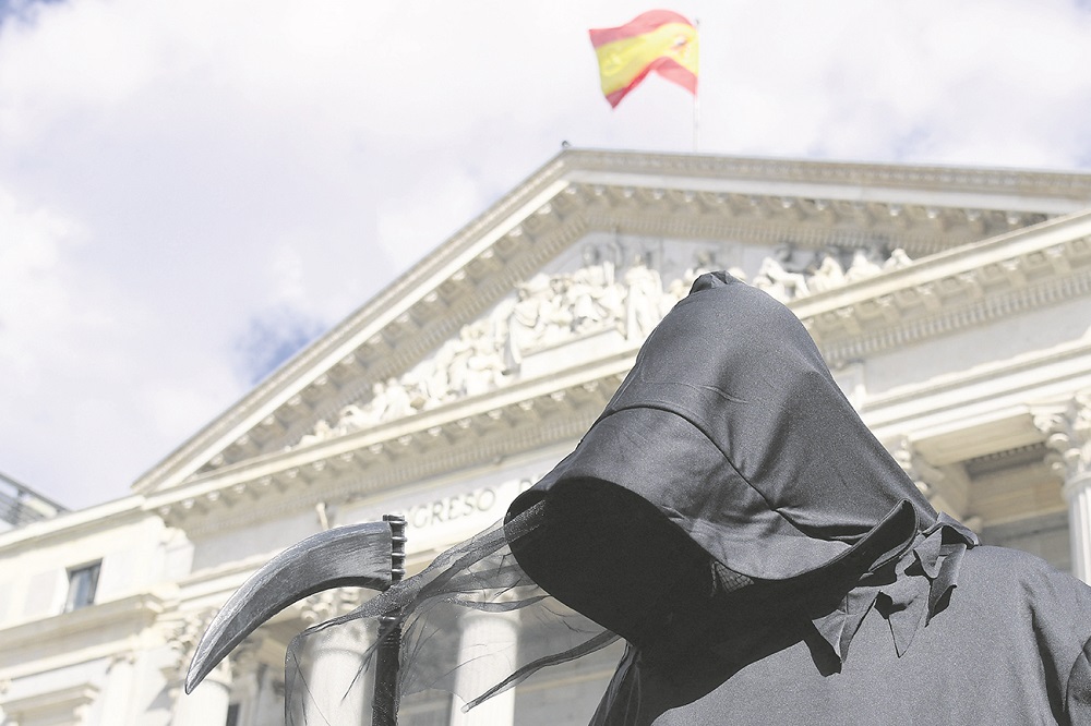 3月18日,安乐死法案的反对者在西班牙议会外扮成死神表达抗议。(法新社图)