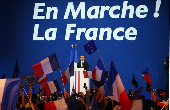 2017年总统大选,马克龙在庆祝集会上。(图片来源:中新社)